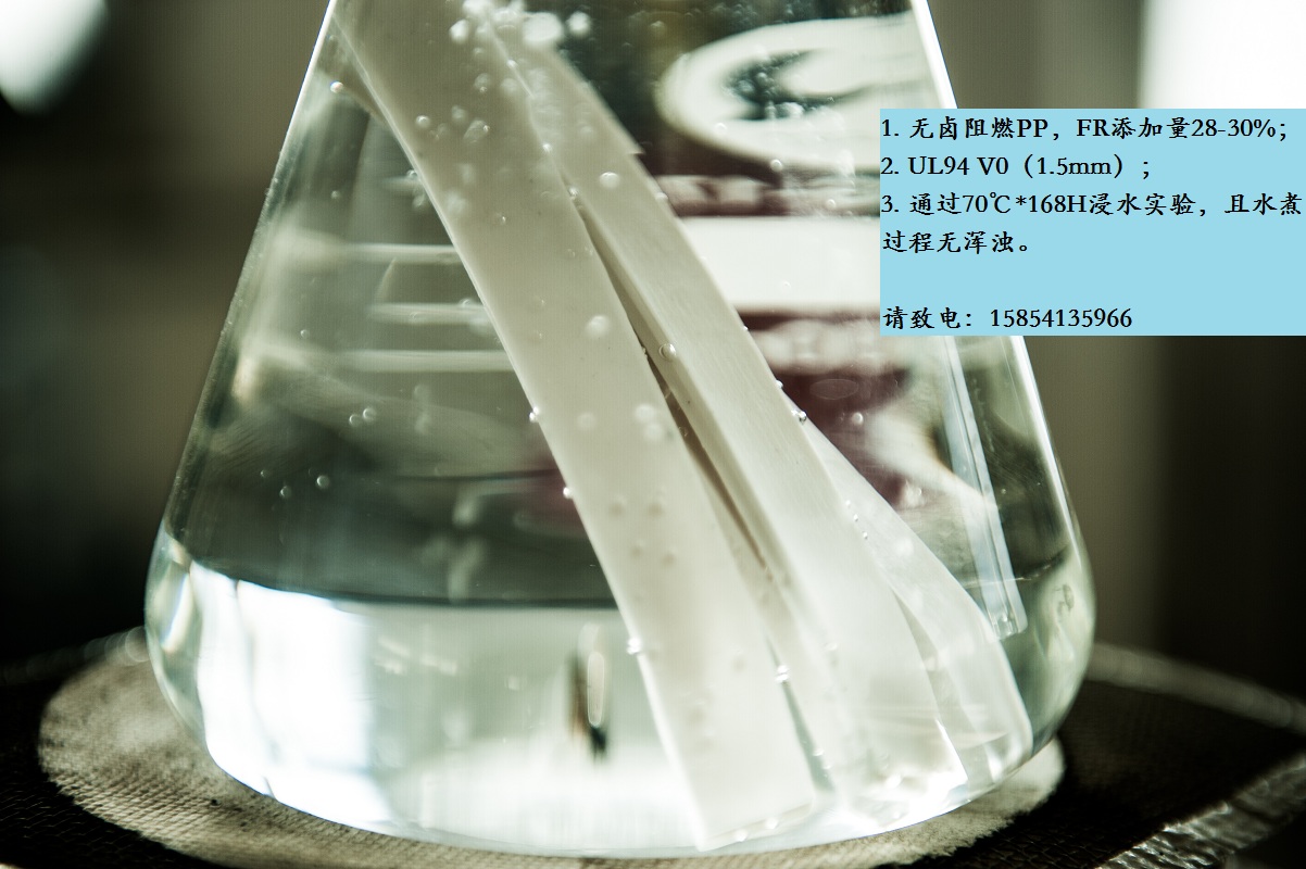 PP無鹵膨脹阻燃劑目前性價比較高的是APP體系,而普通Ⅱ型APP體系的無鹵膨脹阻燃劑存在著析出、粘膜等缺點,我公司采用新型反應(yīng)機理,對普通Ⅱ型APP及其體系的無鹵阻燃劑進行了有機化極性改性。通過大量實驗證明,該無鹵體系與PP的相容性有了極大程度的提高,使得阻燃PP在加工過程中無滑膩、注塑過程中無粘模、浸水實驗無渾濁。