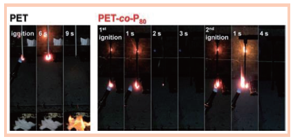 PET智能阻燃是科學(xué)家最近提出的,智能阻燃的PET在成型加工時與普通的PET沒有區(qū)別,但該P(yáng)ET在被點(diǎn)燃時其化學(xué)結(jié)構(gòu)會發(fā)生變化,如發(fā)生快速交聯(lián)應(yīng)用,使其熔體黏度迅速陡增并加速炭化,從而起到阻燃與抗熔滴的雙重作用,如圖1所示。典型的PET智能阻燃是通過熔融縮聚在PET分子鏈中引入可自交聯(lián)功能集團(tuán)(如二苯乙炔、偶氮苯、苯基馬來酰亞胺等),如圖2所示,制備自交共聚酯。所得共聚酯可在保持PET原有特性的情況下,實(shí)現(xiàn)阻燃不熔滴,如圖3所示。同時這種共聚PET中不含任何傳統(tǒng)阻燃元素(如Cl、Br、P等),為綠色阻燃新技術(shù)提供了一種全新的方法。