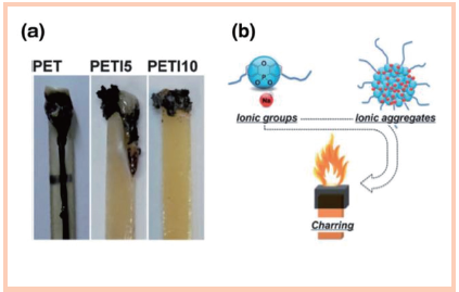 對于智能阻燃PET,科學(xué)家最近還提出了另外兩種類型的智能阻燃技術(shù),即“離子聚合物抗熔滴”和“高溫自重排抗熔滴”。與高溫自交聯(lián)的化學(xué)交聯(lián)相比,離子聚合物以可逆物理交聯(lián)的方式,增大材料熔體粘度,實(shí)現(xiàn)抗熔滴(圖4)??茖W(xué)家最近設(shè)計了一系列含磷離子阻燃單體,所得的離聚物聚酯均表現(xiàn)出較佳的阻燃抗熔滴效果?!案邷刈灾嘏趴谷鄣巍笔峭ㄟ^在 PET 分子鏈中引入可高溫重排的結(jié)構(gòu),在高溫下通過聚合物分子重排,促進(jìn)材料成碳化,實(shí)現(xiàn)阻燃抗熔滴。