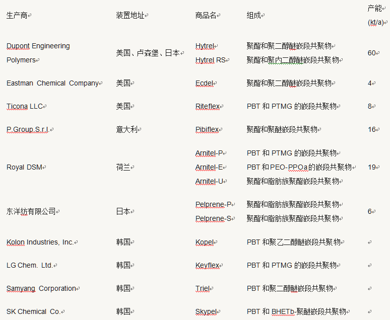 表1 全球TPEE主要生產(chǎn)商及產(chǎn)能